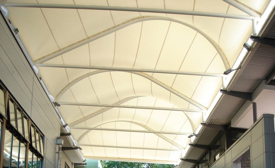 - PVC– This tensile fabric is bendable, soft, and flexible, yet it is also strong and durable. The cloth is also water-resistant, and there are several color options available. PVC-coated fabrics are also fire, UV, and stain-resistant. They can last more than 25 years, depending on factors such as the quality of the PVC coating and the amount of exposure to outdoor conditions such as changes in weather or pollution.